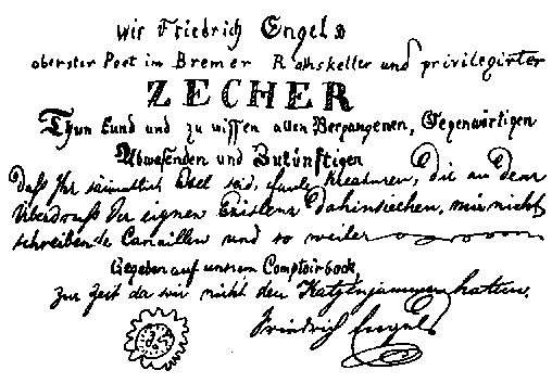 “We, Friedrich Engels, supreme poet in the Bremen town-hall cellar and privileged boozer, announce and make known to all and sundry, past, present, absent and future, that you are all asses, lazy creatures, who are wasting away from disgust with your own existence, scoundrels who don’t write to me, and so on, and so on. Written on our office stool at a time when we had no hangover. Friedrich Engels”